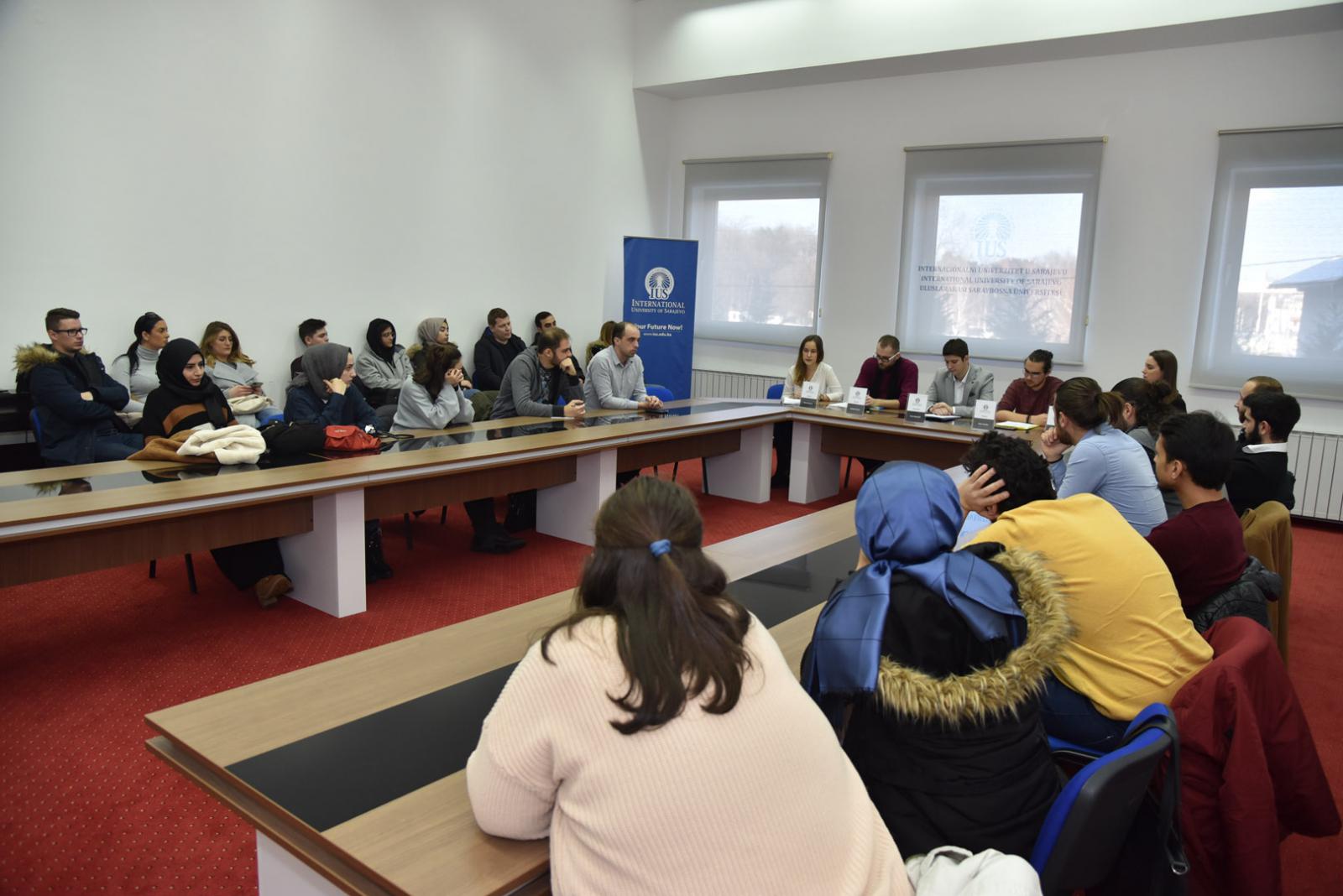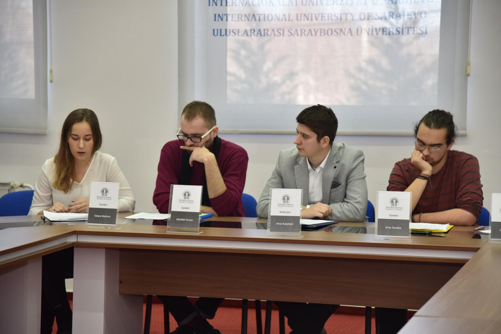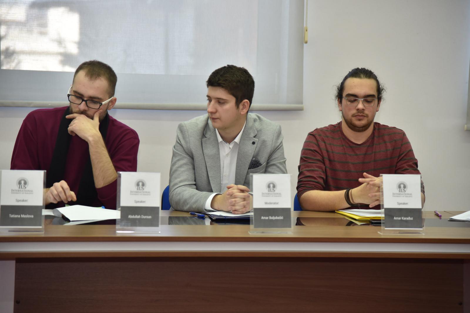 Panelists were students from IUS: Tatiana Maslova (Russia), Amar Karađuz (BiH), Abdullah Dursun (Turkey), and Hena Begović (BiH). The moderator was Mr. Amar Buljubašić (BiH).